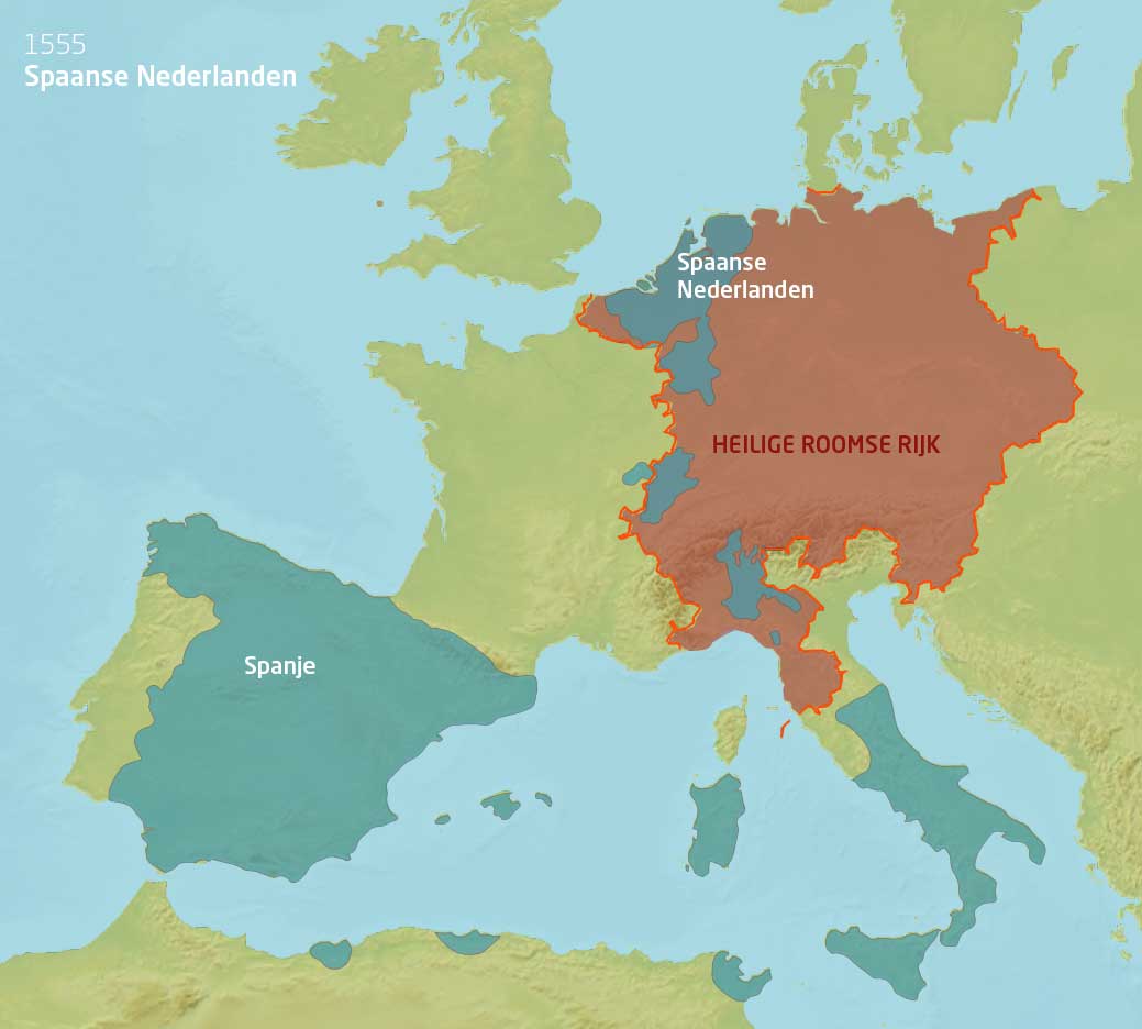 Holland is in de zestiende eeuw nog steeds een graafschap binnen het Duitse keizerrijk, maar het is ook onderdeel van de zeventien Nederlandse provinciën die onder het Bourgondische vorstenhuis zijn verenigd. Sinds 1500 is Karel V uit het Huis Habsburg de landsheer van Holland. Door erfopvolging wordt hij óók keizer van het Duitse Rijk en koning van Spanje. Als hij in 1555 afstand doet van de troon, erft zijn zoon Philips II de Nederlanden en Spanje.